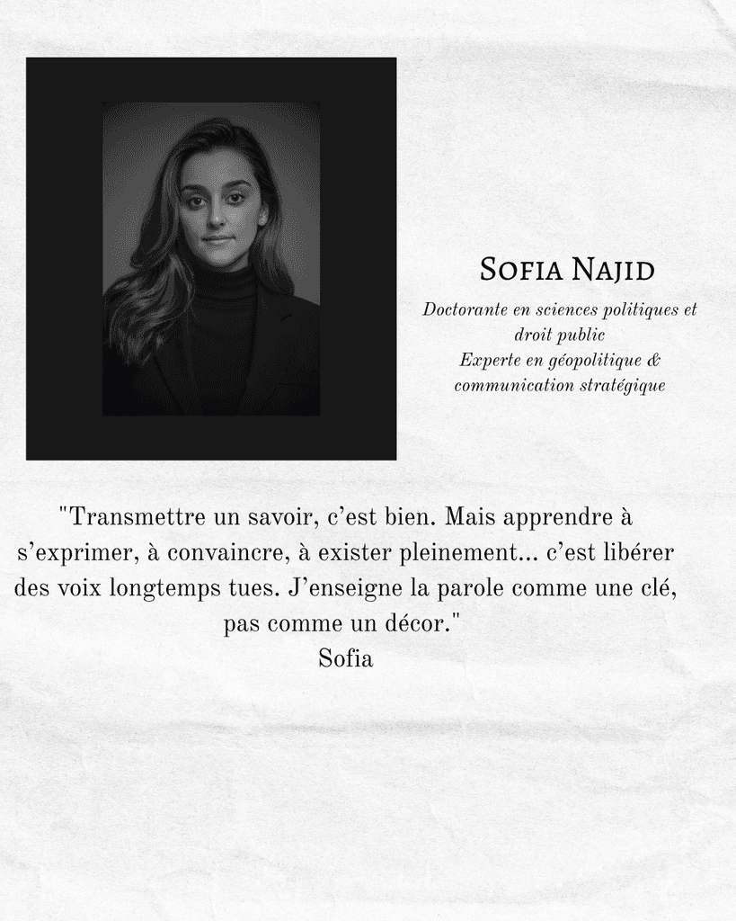 Diplômée de l’Université Paris II Assas et actuellement doctorante en Sciences Politiques, Sofia a exploré le monde du droit, des relations internationales et de la diplomatie à très haut niveau. Elle a travaillé dans des cabinets d’avocats et au sein du Ministère des Affaires Étrangères, avant de représenter le Maroc dans de grandes institutions africaines.