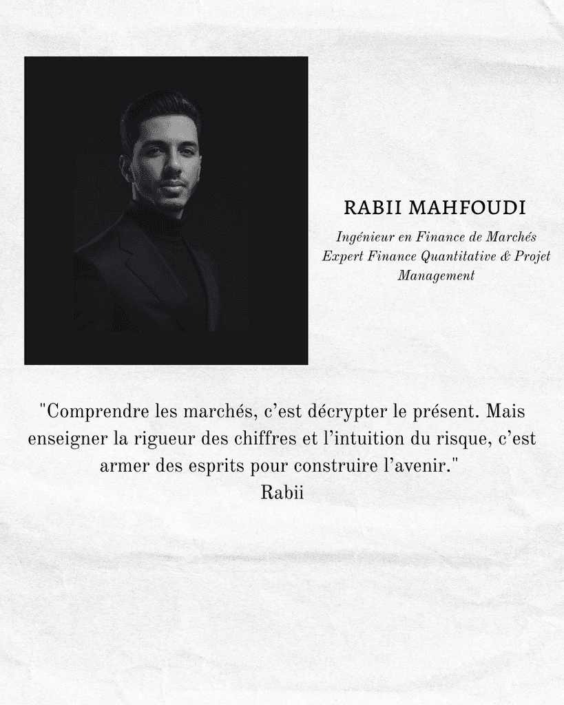 Rabii partage aujourd’hui son expertise pointue en valorisation, gestion des risques, finance réglementaire et outils quantitatifs à travers des formations concrètes, claires et exigeantes.