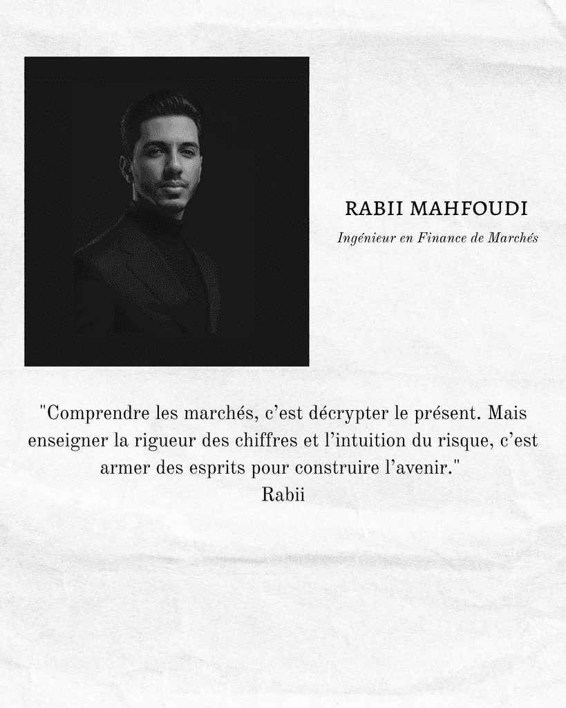 Formé à l’INSEA puis diplômé du mastère spécialisé en finance quantitative de l’EMLYON, Rabii possède un socle académique robuste, combinant excellence technique et rigueur analytique. Son double cursus en actuariat et finance de marché lui donne une maîtrise fine des produits financiers les plus complexes.